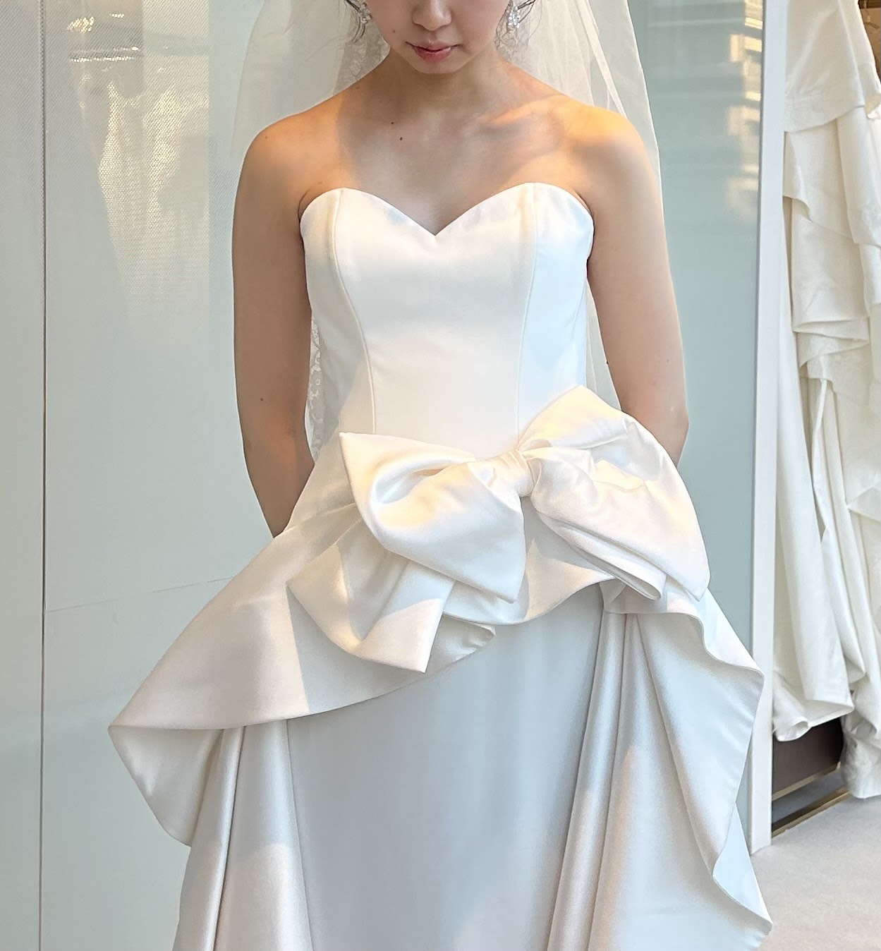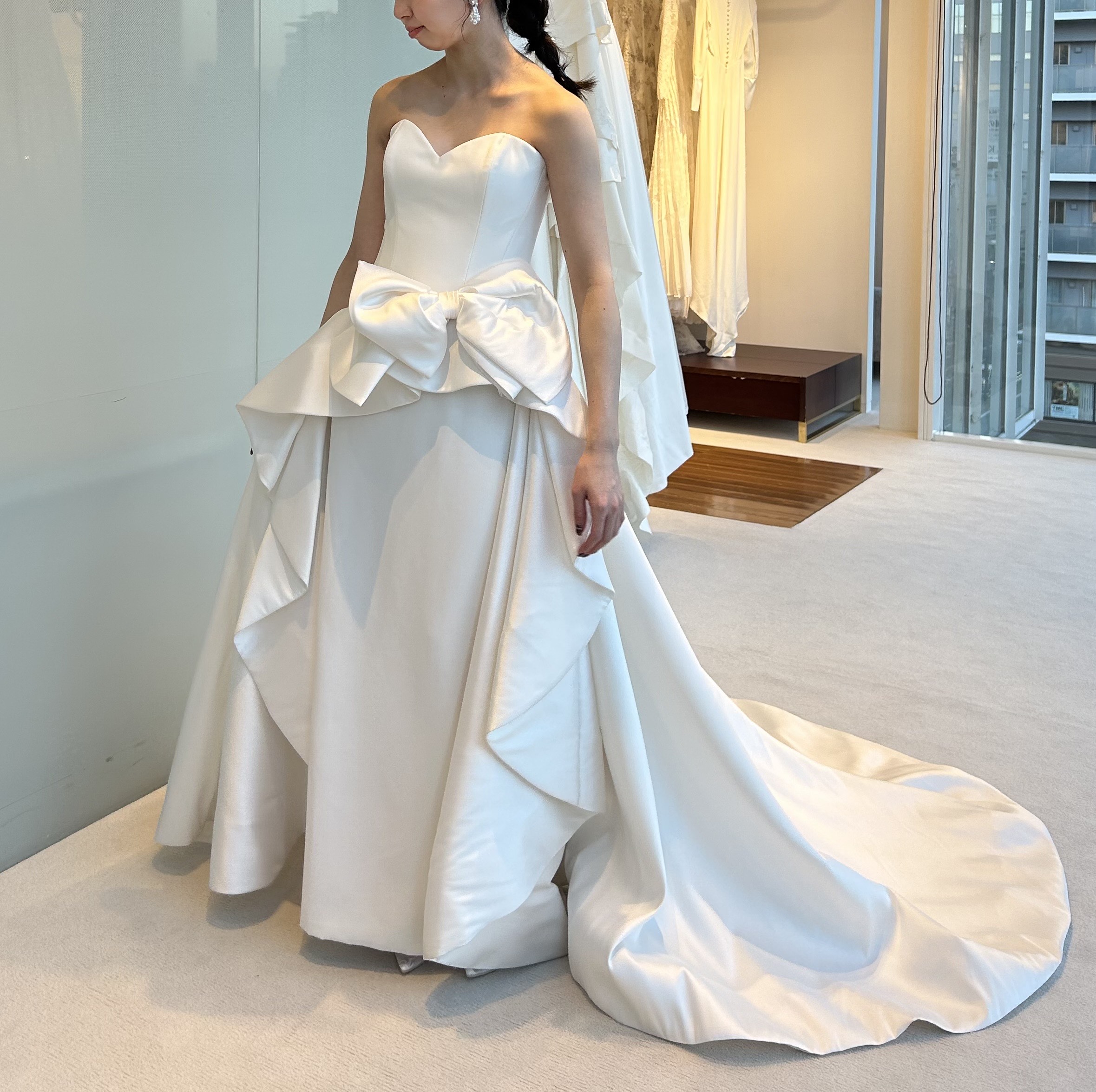 ブランドのイメージですと3Dフラワーのドレスが多い印象ですが、こちらは腰元にボリューム感があり、さらに存在感のあるリボンが目を引きます。