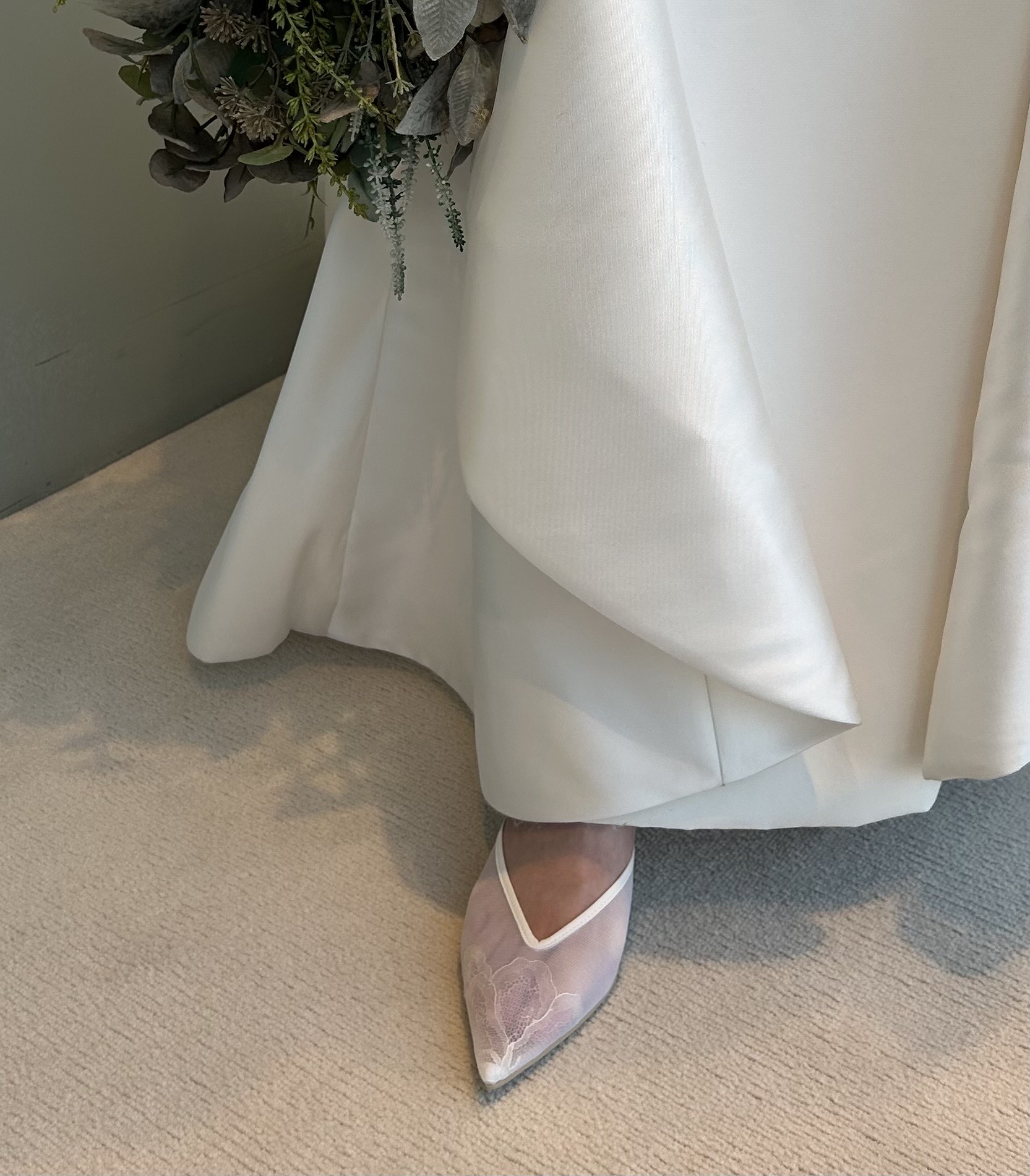 ミカドシルクのつややかなドレスに、足元は抜け感のあるシアーパンプスをお召しいただくことで、メリハリができ、華やかさもプラスしてくれます。