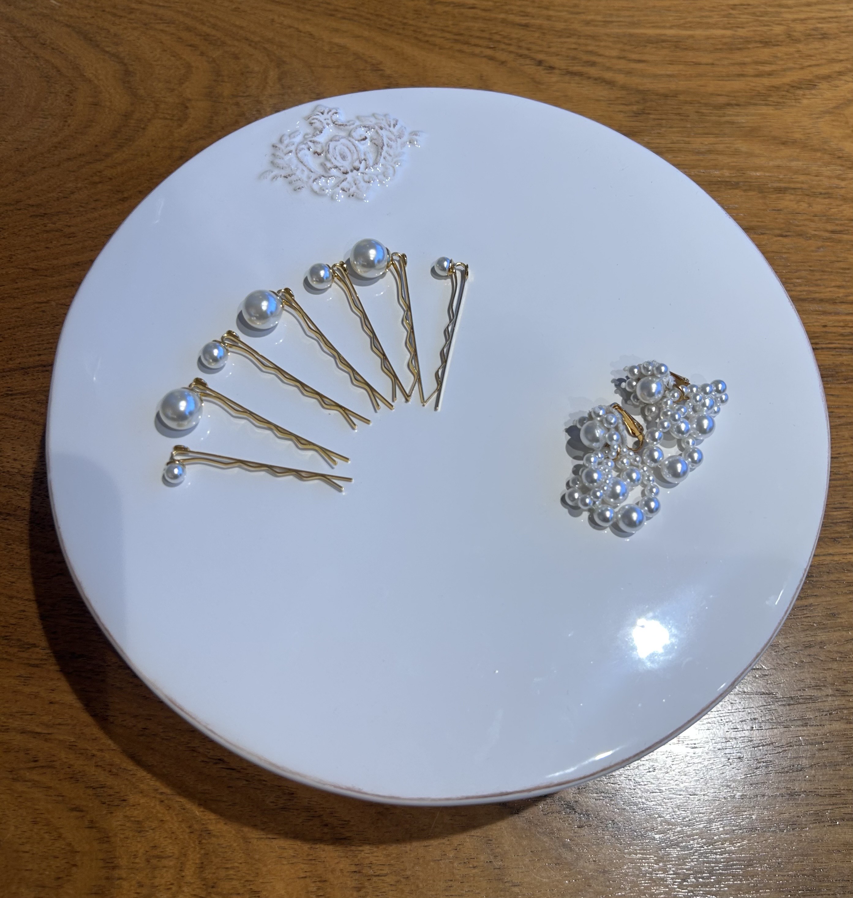 ヘアスタイルは、ロールポニーにパールを散りばめたカジュアルなスタイルに。