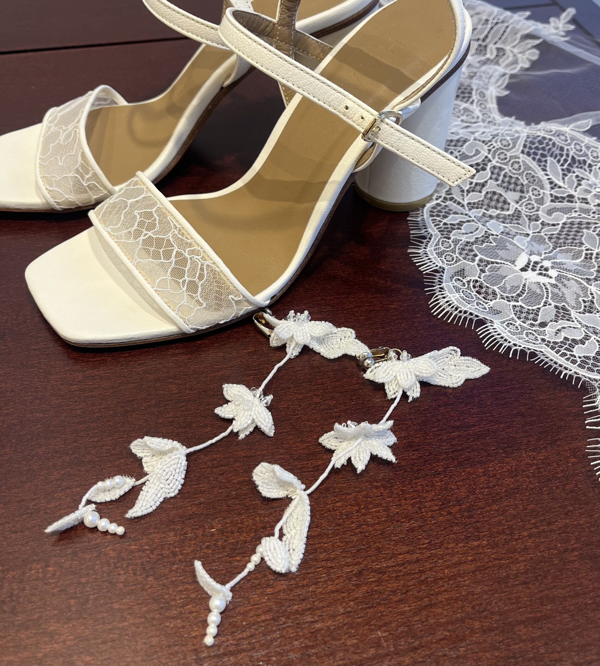 こちらのシューズにもリバーレースが使用されており、足元から見えるフェミニンなデザインはドレスとの相性もばっちりです。