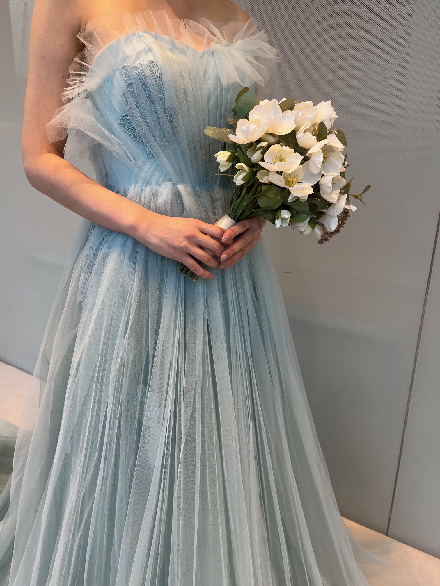 自然光に柔らかく溶け込むような爽やかなアイスブルーのチュールの中に、落ち着きのあるシアンのチュールが重なることで、唯一無二の色味を表現しています。
