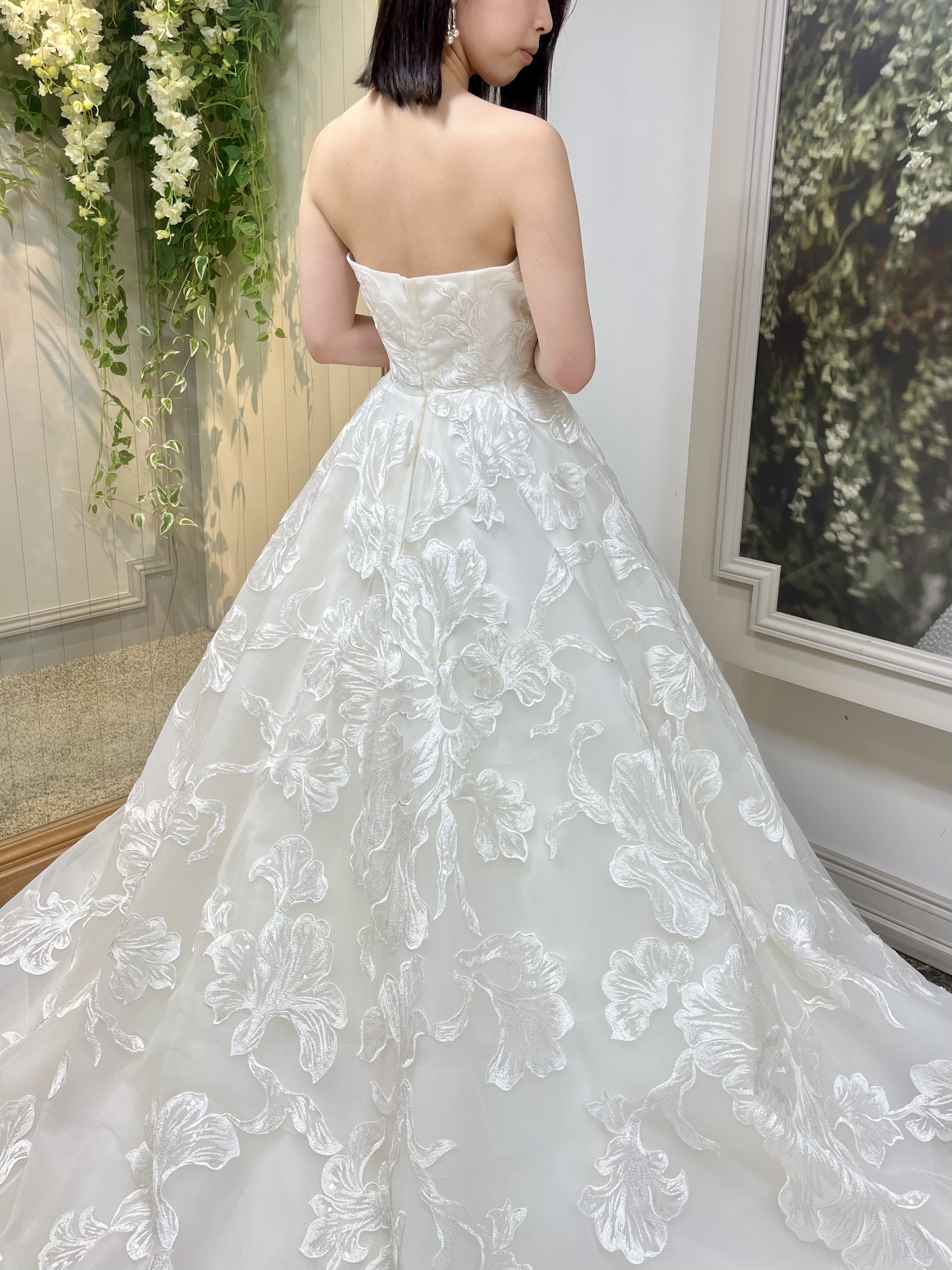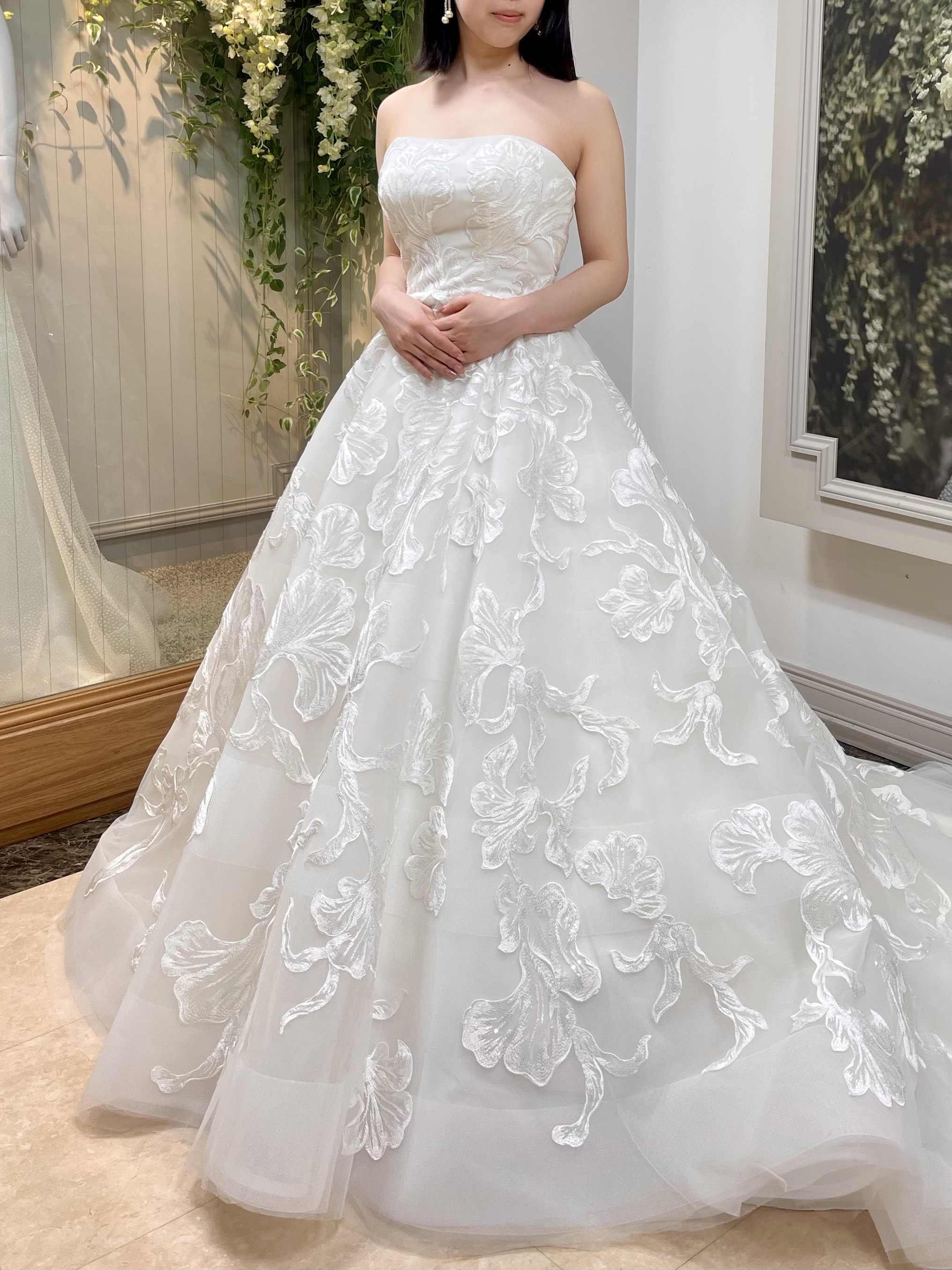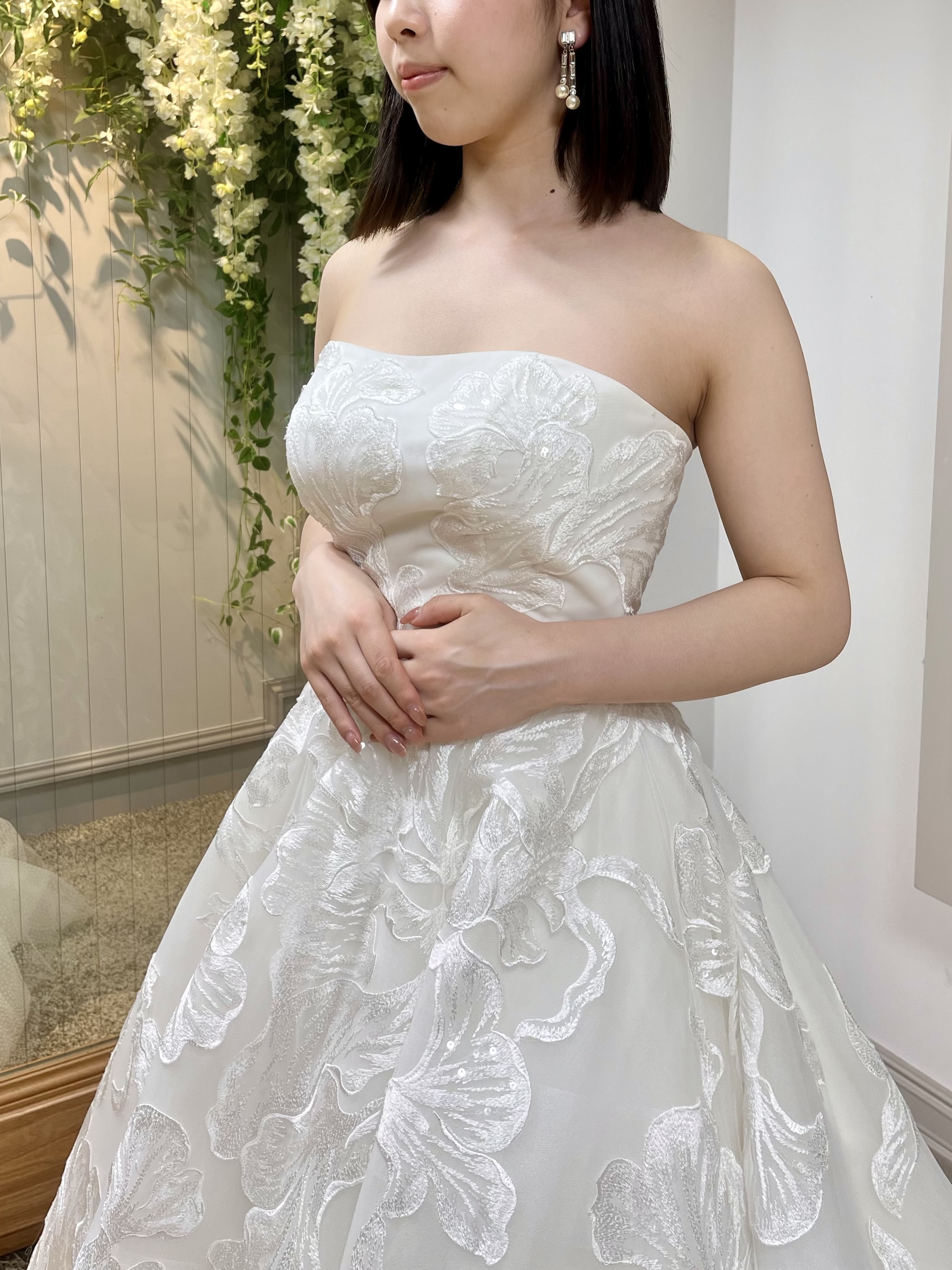 ドレス全体に広がった大柄のお花の刺繍が印象的なウェディングドレス。