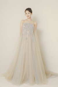 表面に纏った継ぎ目のない1枚仕立てのチュールは、花嫁様の透明感を引き立て、ロマンティックな雰囲気を演出してくれます。